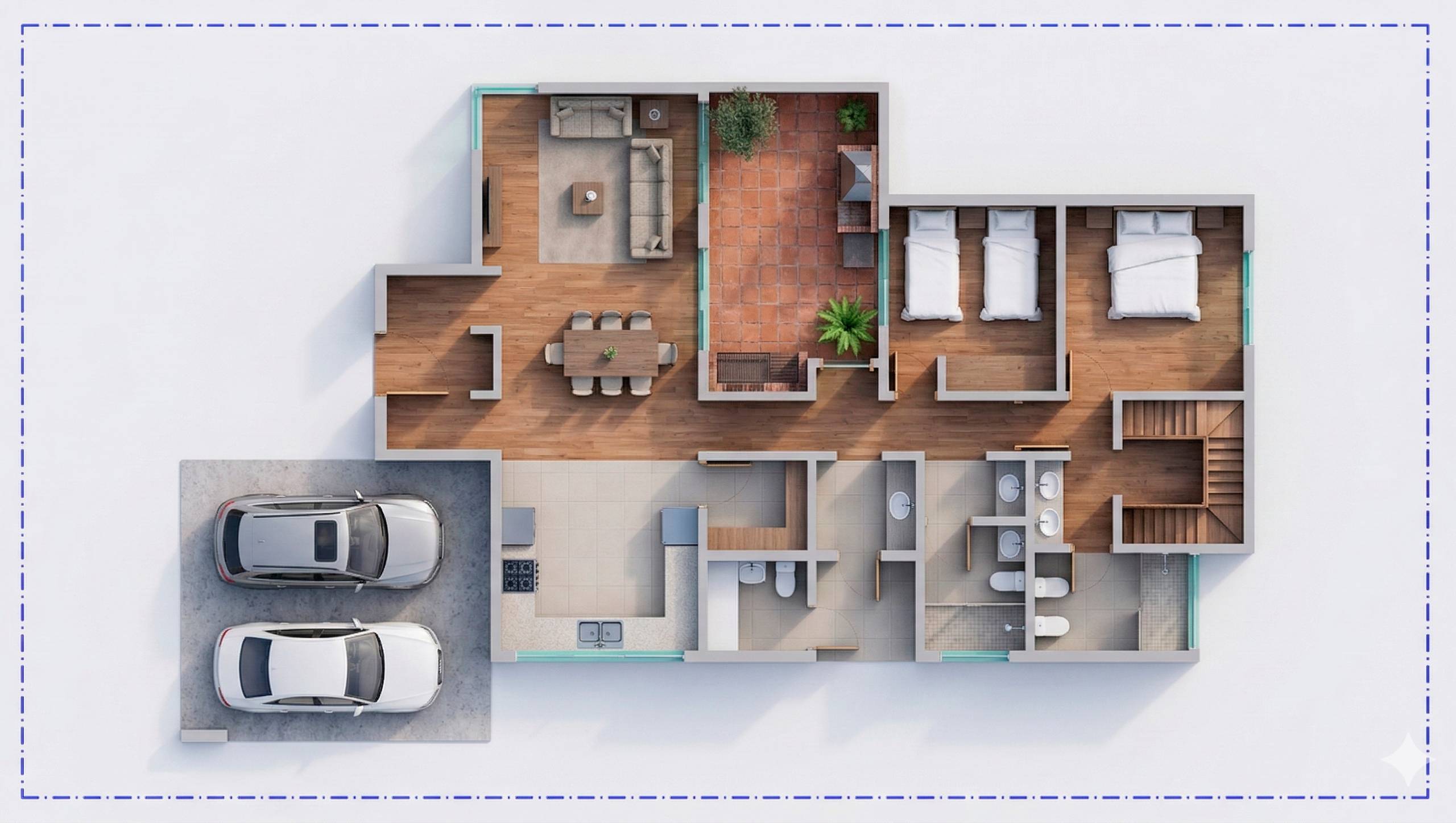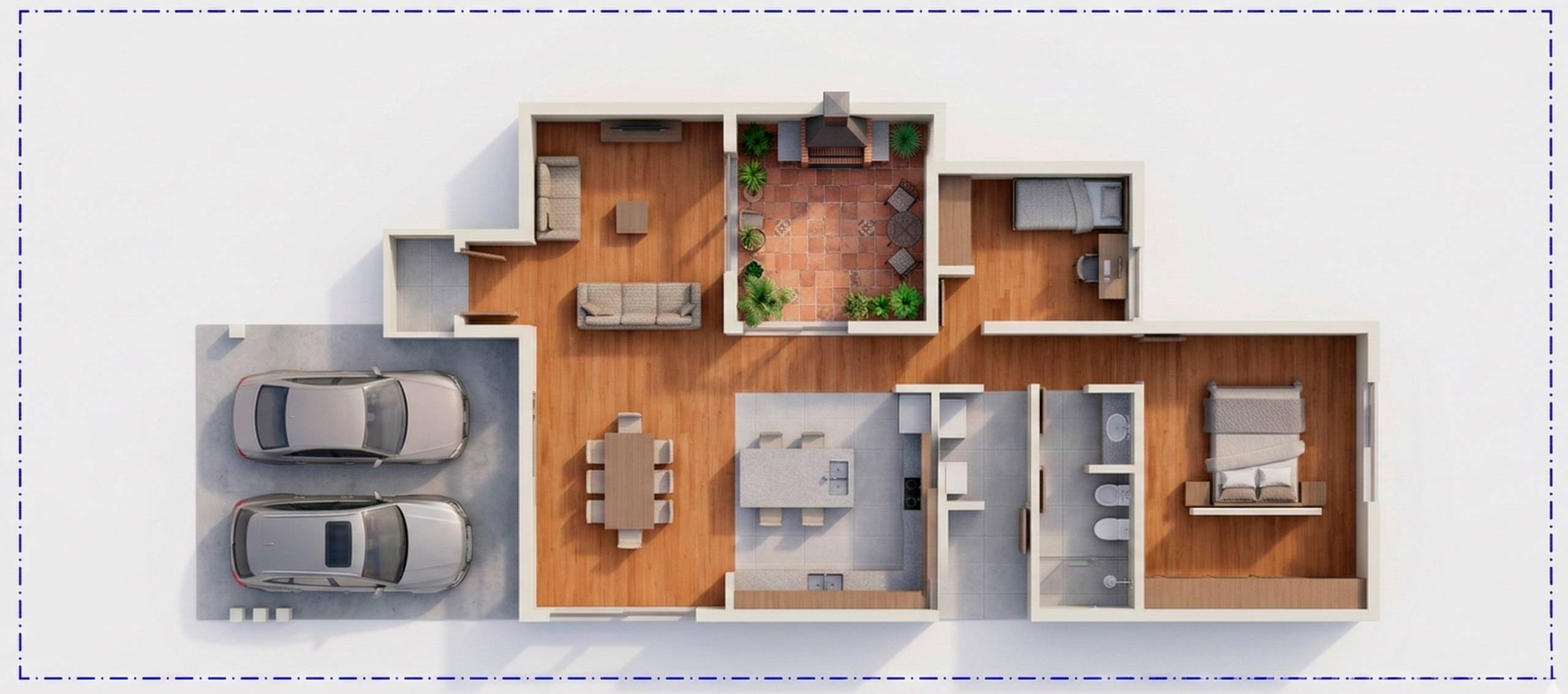 La Tipología B ofrece residencias de 127 m² cubiertos, diseñadas para quienes prefieren un espacio más práctico y fácil de mantener, sin resignar calidad ni diseño. La segunda habitación funciona como un ambiente flexible que puede utilizarse como estudio, oficina o habitación para visitas ocasionales.